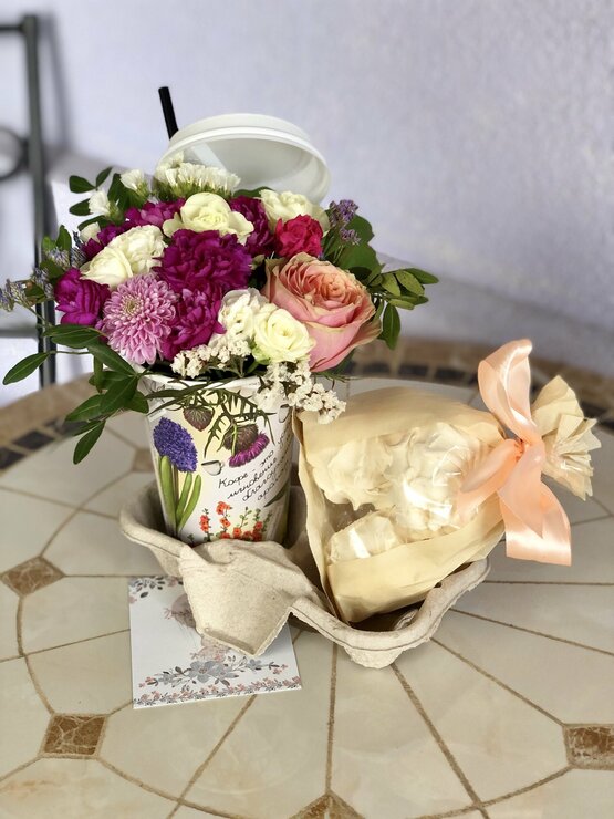 Композиция с цветами в кофейной кружке с зефиром. Радуйте и удивляйте любимых оригинальным презентом без повода. Напишите в комментарии к заказу пожелания по цвету композиции — мы соберём на любом вкус!стаканчик с цветами выполняется из сезонных цветов и композиция может немного отличаться от фото, но непременно будет яркой и красивой:) Доставка цветов. Заказать цветы недорого. С любовью к Вам и к цветам, команда Зеленая лиса.