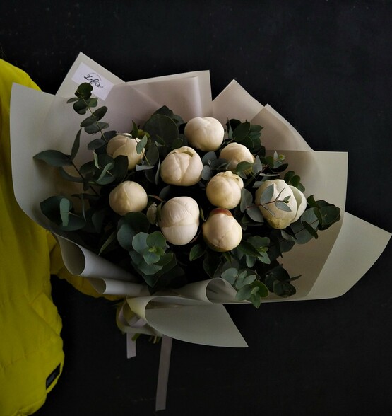 Нежнейший и утонченный букет из белых пионов сорта «дюшес» — комплимент для вашей маленькой принцессы или изысканной герцогини. Доставка цветов. Заказать цветы недорого. С любовью к Вам и к цветам, команда Зеленая лиса.