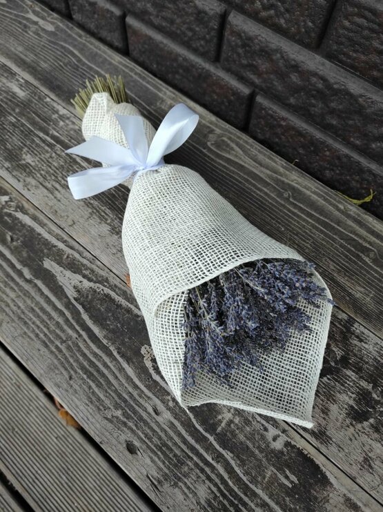 Экологичный букет из ароматной лаванды в мешковине. Доставка цветов. Заказать цветы недорого. С любовью к Вам и к цветам, команда Зеленая лиса.