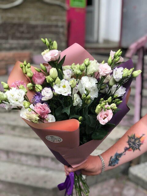 Микс эустом в стильной двухцветной пленке Доставка цветов. Заказать цветы недорого. С любовью к Вам и к цветам, команда Зеленая лиса.