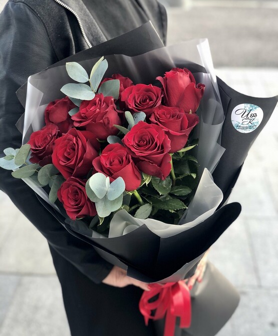 Композиция из высокой эквадорской розы explorer и эвкалипта cinerea в черной крафтовой упаковке. Доставка цветов. Заказать цветы недорого. С любовью к Вам и к цветам, команда Зеленая лиса.