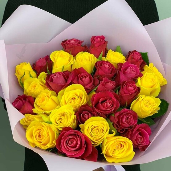 Яркий букет из 31 розы ярких и красочных оттенков не оставит равнодушной ни одну даму. Отличный выбор, если вы еще не знаете о вкусах возлюбленной! Согласно вашим пожеланиям, мы совершенствует каждую композицию и при необходимости данный букет можно дополнить флористическим оазисом, что значительно продлит жизнь икебане. Удивляйте своих любимых всегда только свежими цветами, а мы вам в этом поможем! Доставка цветов. Заказать цветы недорого. С любовью к Вам и к цветам, команда Зеленая лиса.