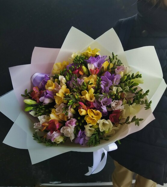 Взрыв красок в ароматном букете из 49 фрезий! Доставка цветов. Заказать цветы недорого. С любовью к Вам и к цветам, команда Зеленая лиса.