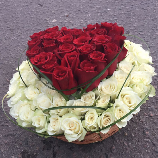 Сердце из роз в корзине. Доставка цветов. Заказать цветы недорого. С любовью к Вам и к цветам, команда Зеленая лиса.