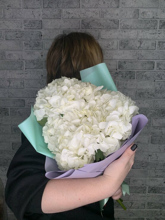 Снежно-нежный сливочный букет из гортензий в красивой упаковке. Доставка цветов. Заказать цветы недорого. С любовью к Вам и к цветам, команда Зеленая лиса.