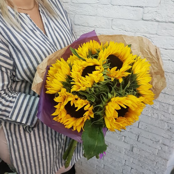Букет ярких крупных подсолнухов поднимет настроение в любую самую пасмурную погоду. И будет радовать получателя много дней Доставка цветов. Заказать цветы недорого. С любовью к Вам и к цветам, команда Зеленая лиса.