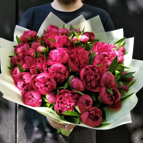 Букет пиона сорта «ред шарм» в лаконичной упаковке. Доставка цветов. Заказать цветы недорого. С любовью к Вам и к цветам, команда Зеленая лиса.