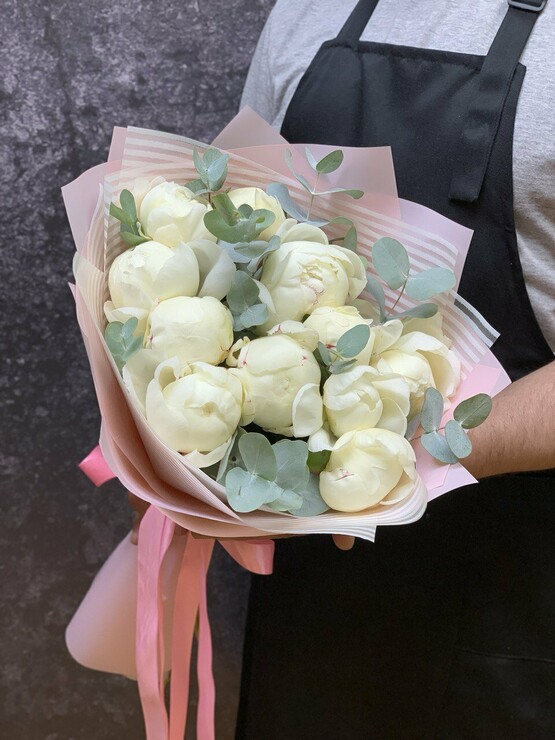 Нежный букет из 11 белых пионов Доставка цветов. Заказать цветы недорого. С любовью к Вам и к цветам, команда Зеленая лиса.