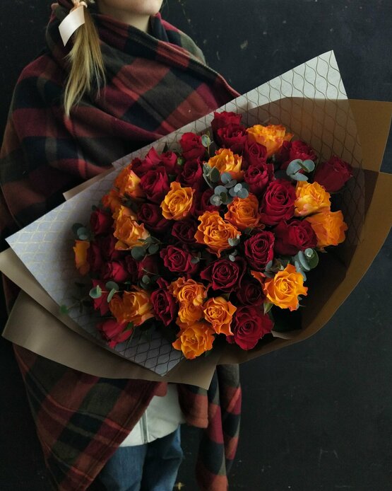 Обворожительный букет из 51 кенийской розы и ароматного эвкалипта — лучший способ признаться в своих страстных чувствах. Доставка цветов. Заказать цветы недорого. С любовью к Вам и к цветам, команда Зеленая лиса.