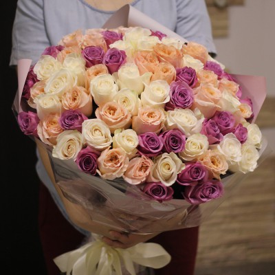 Доставка цветов в Москве » Розы » 101 белая, лиловая и персиковая роза