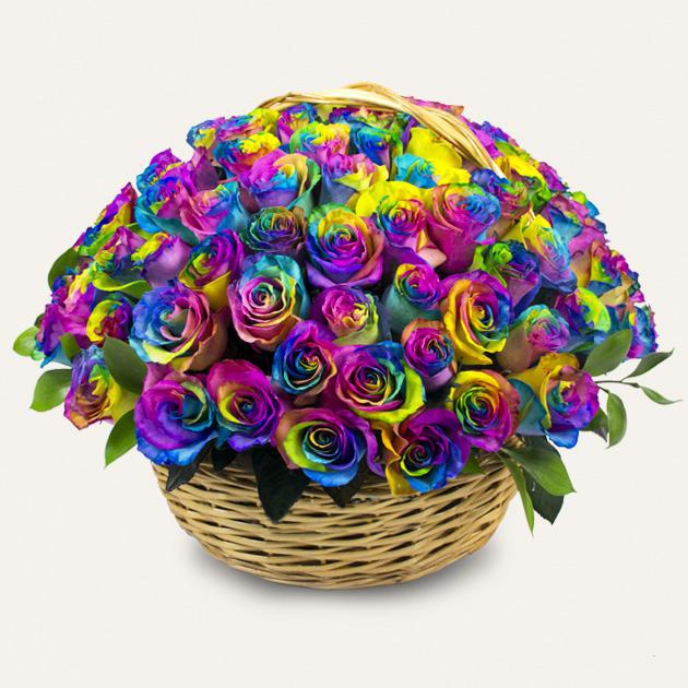 Доставка цветов в Нижнем Новгороде » Розы » 101 радужная роза в корзине