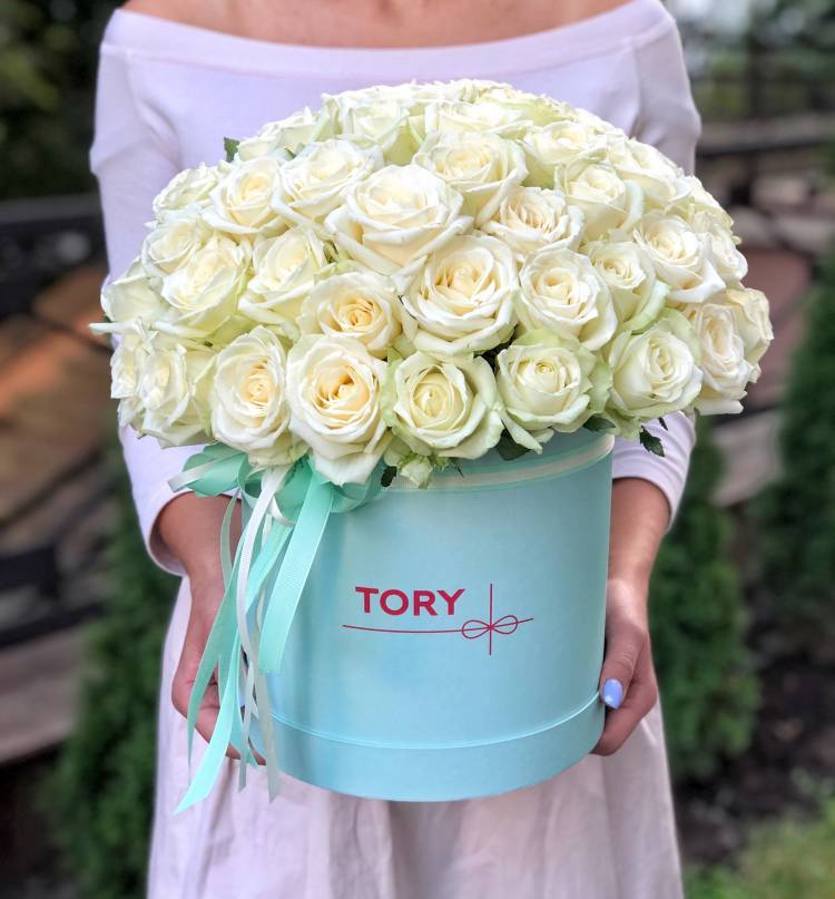 Доставка цветов в Карачаевске » Розы » 51 белая роза в шляпной коробке