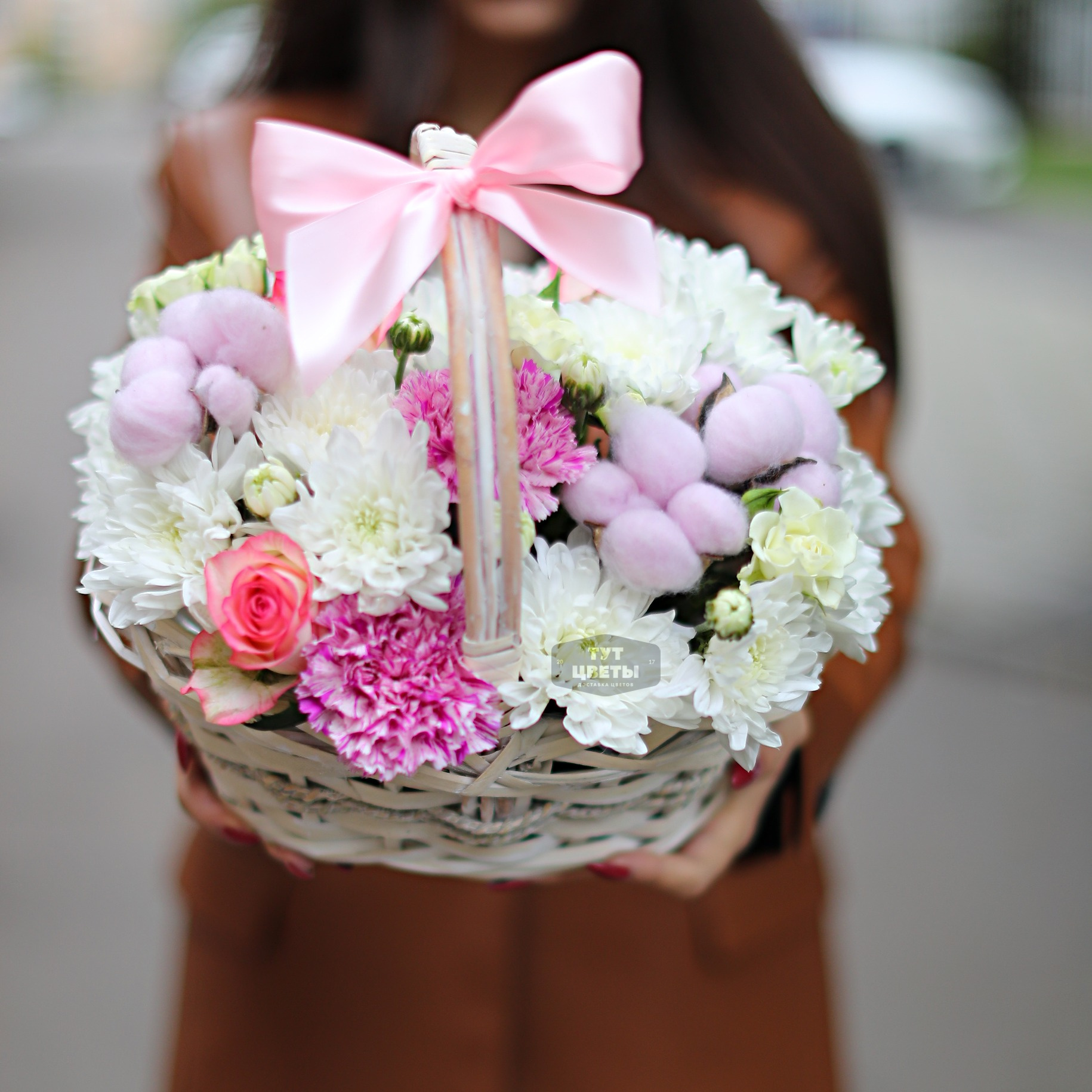 Доставка цветов в Нижнем Новгороде » Гвоздики » Осенняя корзина с хризантемой, розой и гвоздикой