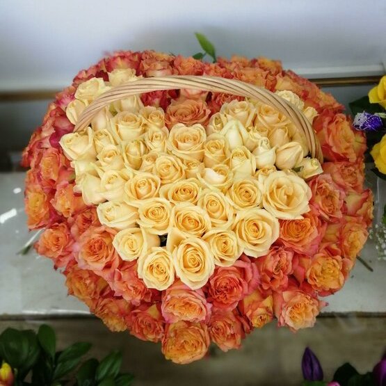 Корзина цветов, в которой 101 роза, скажет все за вас без слов. Букет, трепещущий о ваших чувствах к любимой, будет бережно упакован в аква-пак для безлопастной транспортировки и сохранения свежести композиции. Так же по вашему желанию к букету можно добавить транспортировочную коробку, открытку ручной работы, шарики, сладости и фрукты, мягкую игрушку. Скажите любимой о ваших чувствах к ней, а наши флористы помогут вам составить по истине уникальную композицию! Доставка цветов. Заказать цветы недорого. С любовью к Вам и к цветам, команда Зеленая лиса.