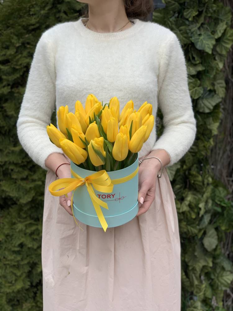 25 желтых тюльпанов в коробке в Краснодаре