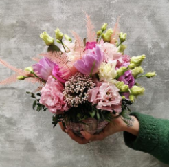 Корзинка с лизиантусом, розами и нежными, сиреневыми тюльпанами