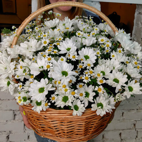 Милая корзинка с ромашками. И пусть она улыбнётся! Доставка цветов. Заказать цветы недорого. С любовью к Вам и к цветам, команда Зеленая лиса.