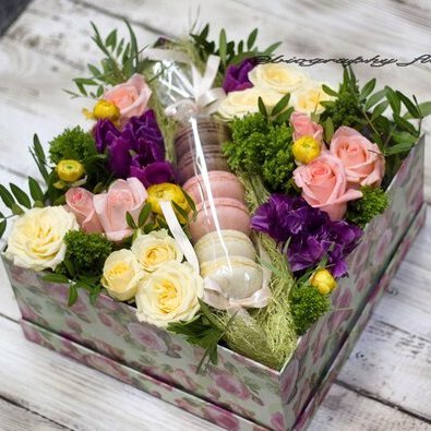 Коробочка со всеми любимыми печенюшками – макарони. Цвет макарони может отличаться от фото, т.к. покупаем их непосредственно перед составлением композиции в соседнем французском ресторанчике, а какое они выпекут в нужный нам момент – не известно. Также и композицию мы не делаем под копирку, т.к. считаем, что каждый букет и композиция должны быть неповторимы, как и обладатель этого произведения. Но состав, визуальное восприятие и свежесть мы гарантируем. Доставка цветов. Заказать цветы недорого. С любовью к Вам и к цветам, команда Зеленая лиса.