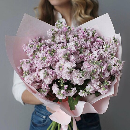 Монобукет из 19 лавандовой ароматной маттиолы в дизайнерской упаковке с атласными лентами Доставка цветов. Заказать цветы недорого. С любовью к Вам и к цветам, команда Зеленая лиса.