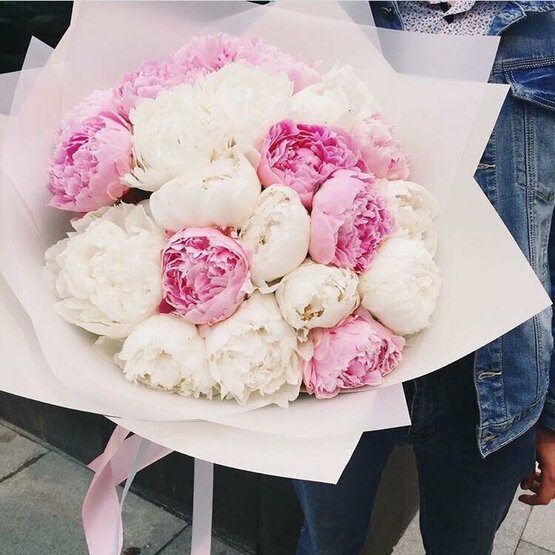 Монобукет из пионов в дизайнерской упаковке с атласными лентами Доставка цветов. Заказать цветы недорого. С любовью к Вам и к цветам, команда Зеленая лиса.