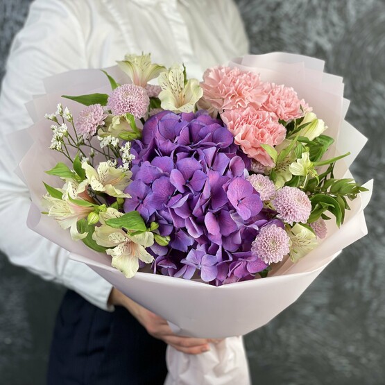 Фактурный букет в нежных тонах с пышной гортензией, ароматными диантусами, пуговками сантини и соцветиями альстромерии. Доставка цветов. Заказать цветы недорого. С любовью к Вам и к цветам, команда Зеленая лиса.